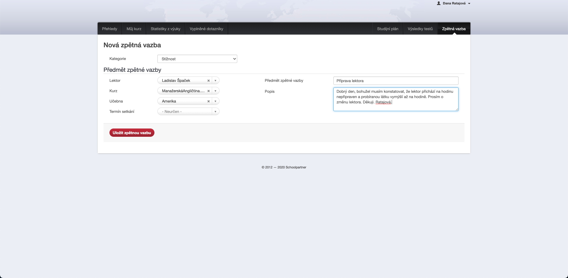 Online systém Schoolpartner je součástí našich služeb i podnikání. Byli jsme od počátku u jeho vývoje jako pilotní projekt menší školy a plní nám vše, co potřebujeme: šetří čas při koordinaci a fakturaci kurzů, snižuje chybovost lektorů i koordinátorů na minimum, ulehčuje práci a šetří komunikaci kolem předávání informací o kurzech i studentech, umožňuje online reporting a přispívá tak celkově k mnohem vyšší přidané hodnotě našich služeb: klienti i studenti mají vždy přehled o svých kurzech, vše je na jednom místě a snadno dohledatelné. Systém umožňuje nastavit automatické operace jako rozpočítání cestovného, podílů studentů, rozdělení nákladů dle středisek, atd. Ulehčuje práci s emailingem, sdělování informací a zpracování dotazníků je rychlé a snadné. Umožňuje také export veškerých dat i do jiných formátů kompatibilních s ostatními programy, veškeré běžné úkony (omluvenky, pozdní storna, atd.) jsou automatizované. Díky tomu je např. kompletní měsíční fakturace otázkou pár hodin a pracovní úvazky na koordinaci jsou minimální při zachování vysokého standardu zákaznického servisu.